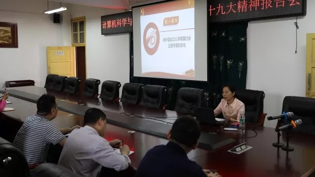 为深入学习贯彻党的十九大精神,2018年5月11日下午,DB真人旗舰学习和贯彻党的十九大精神报告会在计算机楼312会议室举行。马克思主义公司翟光艳老师主讲,DB真人旗舰班子成员和全体教师以及全体员工党员、党员发展对象聆听了此次报告会。