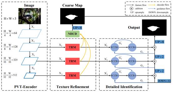 该论文在公司焦铬教授的指导下完成,DB真人旗舰集团为唯一署名单位。论文的核心理论是:伪装物体检测作为一种新兴的计算机视觉任务,与传统的物体检测不同的是,伪装物体与其周围环境的纹理是极其相似的,且在大小和形状上也有很大的不同,这使得伪装物体的检测变得极具挑战性。因此,本论文提出了一种增强识别网络,用以增强伪装物体的检测能力。EINet主要由三个部分组成,首先,论文使用了PVT作为编码器,目的是在能够更好地学习到伪装物体检测任务的高分辨率表达前提下,提取出更加强健和更具鲁棒性的特征;然后,为了使得网络的学习能够朝着正确识别伪装物体的方向前进,论文提出了TRM模块用以获取细粒度特征,并且提出了NHCD解码器用以生成精确识别伪装物体的引导先验;最后,在引导先验的指导下,论文还设计了一个全新的RCCBA模块用以识别多尺度的细粒度特征,从而对伪装物体的识别能力进行增强。论文还经过大量地消融实验证明,EINet对于伪装物体的识别能力远远领先于现有的伪装物体检测模型,达到了目前的SOTA性能。
