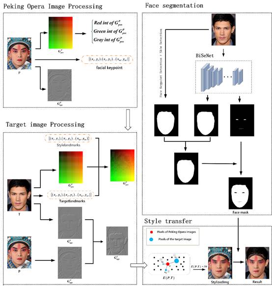 该论文是在公司梁小满教授的指导下完成,DB真人旗舰、智能信息处理与应用湖南省重点实验室为署名单位。论文核心理论是:当使用标准的神经网络迁移方法进行人像风格迁移时,往往不能保证语义上的正确转移;风格实例中的纹理细节往往被忽略。本文提出了一种名为POFMakeup的京剧脸谱风格转移方法,方法的技术路线如图1所示。这种方法可以将带有京剧脸谱的人像的风格转移到另一个人像上。该方法使用两个指南,位置指南和外观指南。位置指南保证了转移过程中语义的一致性,而外观指南则保证了转移过程中目标对象的外观能够被保留下来。实验结果表明,该方法不仅解决了传统人像风格转换的问题,而且能够快速、完美地实现京剧脸谱的风格转换。提出的方法在结构相似度(SSIM)方面比传统方法提高了17%。