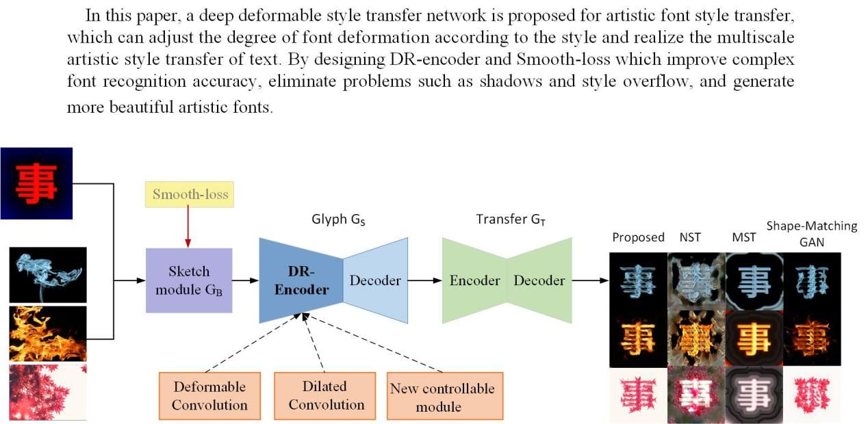 该论文是在公司林睦纲副教授的指导下完成,DB真人旗舰集团为唯一署名单位。论文核心理论是:字体样式转移的本质是在保持字体字形结构的同时,将图像的样式特征转移到字体中。目前,基于卷积神经网络的生成对抗网络在字体样式生成中发挥着重要作用。然而,传统的卷积神经网络识别字体图像存在对未知图像变化适应性差、泛化能力弱、纹理特征提取能力差等问题。当字形结构非常复杂时,复杂字体图像无法有效识别。本文提出了一种用于艺术字体风格转移的深度可变形风格迁移网络,该网络可以根据风格调整字体的变形程度,实现文本的多尺度艺术风格转移。该模型包括用于学习字形映射的草图模块、用于学习风格特征的字形模块和用于融合风格纹理的迁移模块。在字形模块中,设计了Deform-Resblock编码器来提取字形特征,其中引入了可变形卷积,改变残差模块的大小,实现了不同尺度特征信息的融合,更好地保留了字体结构,增强了文本变形的可控性。因此,我们的网络对文字的控制能力更强,对图像特征信息的处理能力更强,能够产生更加精美的艺术字体。