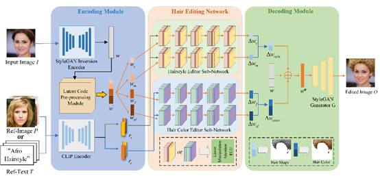 该论文是在公司赵辉煌教授的指导下完成,DB真人旗舰集团为第一署名单位。论文核心理论是:由于头发材质和形状的复杂多样使得头发编辑具有挑战性。许多现有的方法使用参考图像、绘制好的遮罩对头发进行编辑,已经取得比较好的结果。然而,由于源头发颜色、形状和目标头发之间的差异性,导致现有的方法生成的结果有时并不真实、自然。因此,我们提出一种新的头发编辑方法命名为HairManip。我们将输入的源图像的头发信息进行解耦,分离成形状和颜色信息,并训练相应的发型和发色编辑子网络来分别处理这些复杂的信息,从而实现对头发更加精细的操纵。为了进一步提高编辑头发的效率和精度,我们设计了一个新的latent code 预处理模块来提取头发区域的有效特征,提高模型的编辑能力和生成图像的质量。实验结果表明,得益于精心设计的网络结构和损失函数,我们的方法在编辑准确性和真实性方面取得了显著效果。代码见https://github.com/Zlin0530/HairManip。