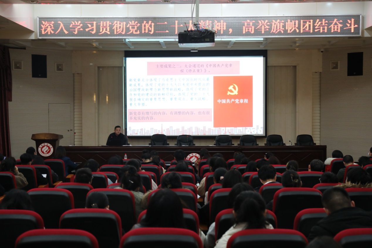 魏晓林以“高举旗帜,团结奋进——深入贯彻党的二十大精神”为题,从“全面领会党的二十大的主题及主要成果”、“深刻认识新时代十年的伟大变革及其里程碑意义”、“不断开辟马克思主义中国化时代化新境界”、“牢牢把握中国式现代化的中国特色和本质要求”、“全面建设社会主义现代国家的目标任务”、“坚持党的全面领导和全面从严治党”、以及“应对风险挑战和团结奋斗的精神状态”等七个方面,深刻阐述了党的二十大主题、主要成果、重大意义和二十大精神的核心要义,解读了党中央实施科教兴国战略和推进教育、科技、人才“三位一体”的重大部署,总结了公司在新时代十年取得的非凡成绩,回顾了衡师光辉的百年红色校史,并阐述了当前和今后一个时期公司的目标任务。他结合公司发展实际,号召广大党员同志以党的二十大精神为指引,坚守立德树人初心使命,把爱党爱国之情化为团结奋斗的力量,着力办好人民满意的教育,加快将公司建设成为特色鲜明的高水平师范大学。