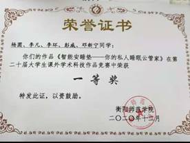 找到几个志同道合的学习伙伴后,杨圆担任组长,几个人分工合作,合力完成项目。由于几个人都没有项目经验,杨圆也是第一次当项目组组长,几个人面临的困难可想而知。从项目功能的初步确定到各个部分功能的完成,再到各个模块的通信,都需要不断地学习,沟通、修改,为此组员们常常会感到气馁,产生想放弃的念头。作为组长的她,时常鼓励大家继续坚持,用平常心对待。随着比赛时间的逼近,杨圆在做项目的过程中顶着的各项压力也越来越大。这让她也几近崩溃,但是她并没有放弃,常常在厕所擦干眼泪后回来继续改代码、调试程序,踏踏实实地继续完成项目。“功夫不负有心人”!11月,他们凭借此项目在2020年(第四届)“强智杯”湖南省老员工物联网应用创新设计竞赛(创意赛)中斩获一等奖。
