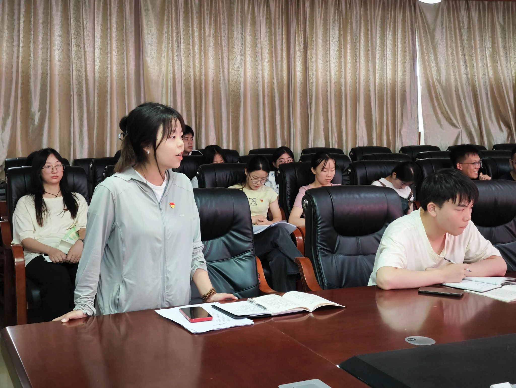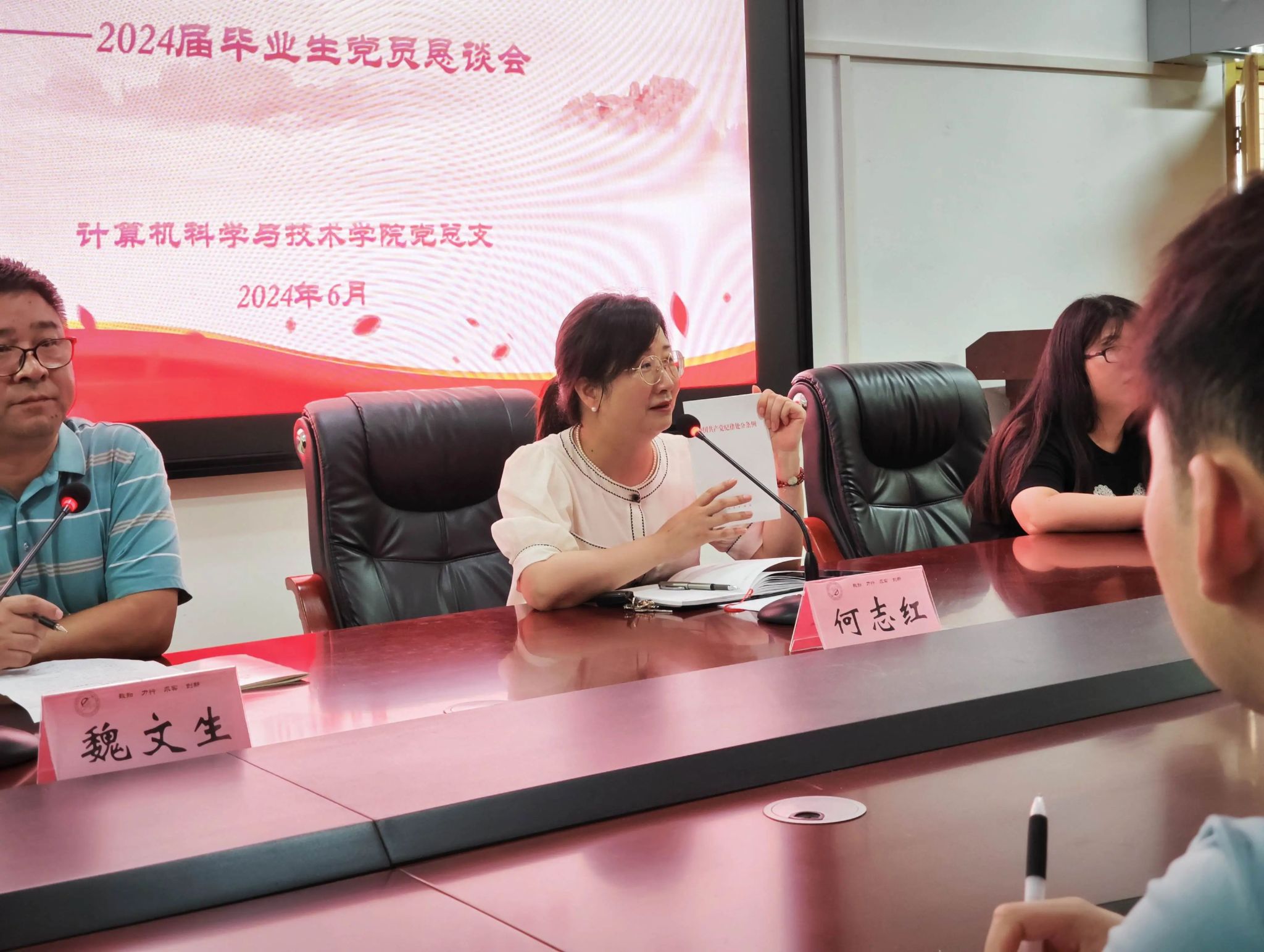 会议伊始,党总支书记何志红向毕业生党员赠送盖有DB真人旗舰党总支红印的《中国共产党纪律处分条例》学习册,并寄语了八字希望:“守正创新,行稳致远”。她强调,党员无论身处何地都应不忘初心、牢记使命,毕业生党员更应加强思想锤炼,坚持正确的政治方向,始终保持对党的忠诚和热爱。