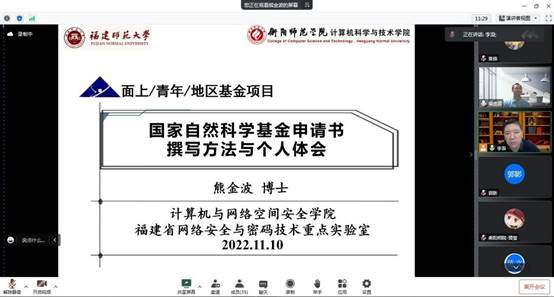2022年11月10日20:00,公司2023年度国家自然科学基金申报交流会使用腾讯会议线上召开,特邀福建师范大学熊金波教授作学术报告,会议由公司经理李浪教授主持,DB真人旗舰部分老师及研究生参加了此次会议。
