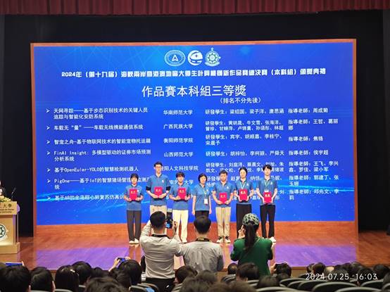 2024年7月23-7月26日在澳门理工大学举办海峡两岸暨港澳地区老员工计算机创新作品赛(本科组)总决赛。本次比赛覆盖全国29个省(含港澳台)323所高校,共有1637个作品参赛。公司焦铬教授指导的员工宾宇、胡顺嘉、宋晨予、李桂宁的作品“智宠之舟-基于物联网技术的智能宠物托运箱统”获得全国三等奖。