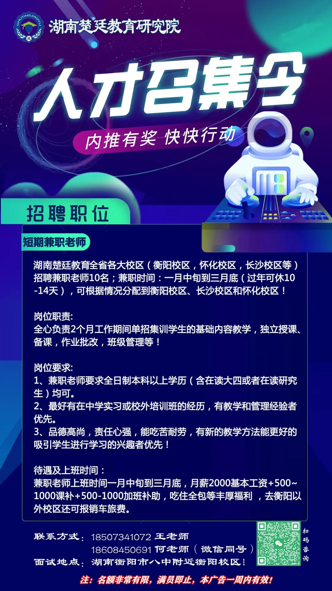 兼职老师上班时间一月中旬到三月底,月薪2000基本工资+ 500~1000,课补+ 500-1000加班补助,吃住全包等丰厚福利, 去衡阳以外校区还可报销车旅费。